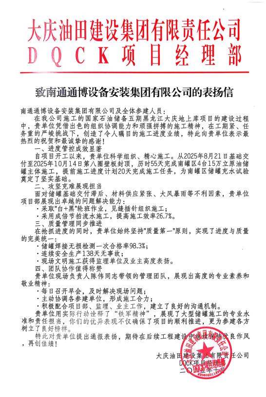 金秋十月的大慶,清風送爽,碩果盈枝。這片承載著光榮與夢想的熱土,在收獲的季節(jié)里煥發(fā)出更加蓬勃的生機。14日下午2點,第三分公司大慶DQCK項目部工地上,機器轟鳴、繁忙如常,在集團董事、常務(wù)副總趙偉斌的帶領(lǐng)下,正緊張進行第四臺15萬立方米儲罐的封頂作業(yè)。自今年5月進駐以來,項目部全體人員對標鐵人王進喜,將“鐵人精神”深深鐫刻在每一次精準操作、每一項技術(shù)突破之中。工地內(nèi)外,“通博風華”處處綻放——從高效推進項目進程,到精細管控降本增效;從安全生產(chǎn)的嚴謹細節(jié),到綠色低碳的堅定踐行。8月21日儲罐基礎(chǔ)交付至10月14日第八圈壁板封頂僅歷時55天提前20天完成了南罐區(qū)4臺15萬立方米原油儲罐封頂,為南罐區(qū)儲罐充水試驗奠定了堅實基礎(chǔ)。大慶油田建設(shè)集團向我司函寄了表揚信,表揚全體參建人員克服了工期緊、任務(wù)重的嚴峻挑戰(zhàn),創(chuàng)造了令人矚目的施工進度業(yè)績;并向項目負責人陳偉頒發(fā)了“優(yōu)秀管理者”榮譽證書,盛贊了我司大型儲罐施工的專業(yè)水準和責任擔當!通博人以實干擔當詮釋新時代“鐵人精神”的深刻內(nèi)涵,以銳意進取、追求卓越展現(xiàn)“通博風華”。